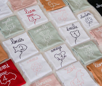 - L'impression sera en blanc sur les vêtements noirs, sauge, caramel et rose.