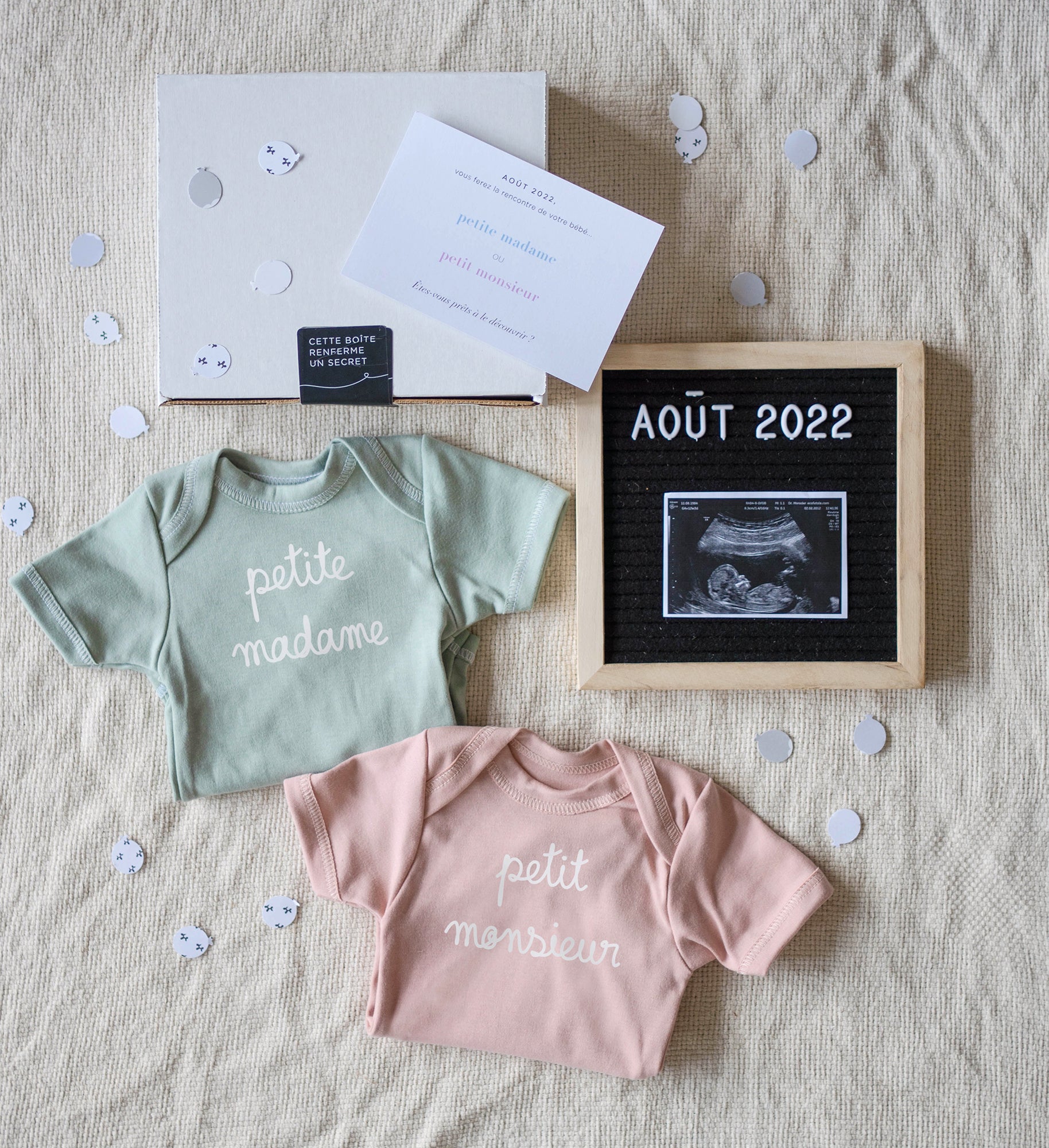Il conviendra que cet article doit être commandé par une personne dans la confidence pour que les parents ne sachent pas quel design se cache dans la boîte. Les résultats du test ADN ou de l'échographie de morphologie, ainsi que les personnalisations à inscrire dans les deux cas et les préférences de coloris devront donc lui être transmis pour qu'elle puisse commander ici le modèle personnalisé adéquat.