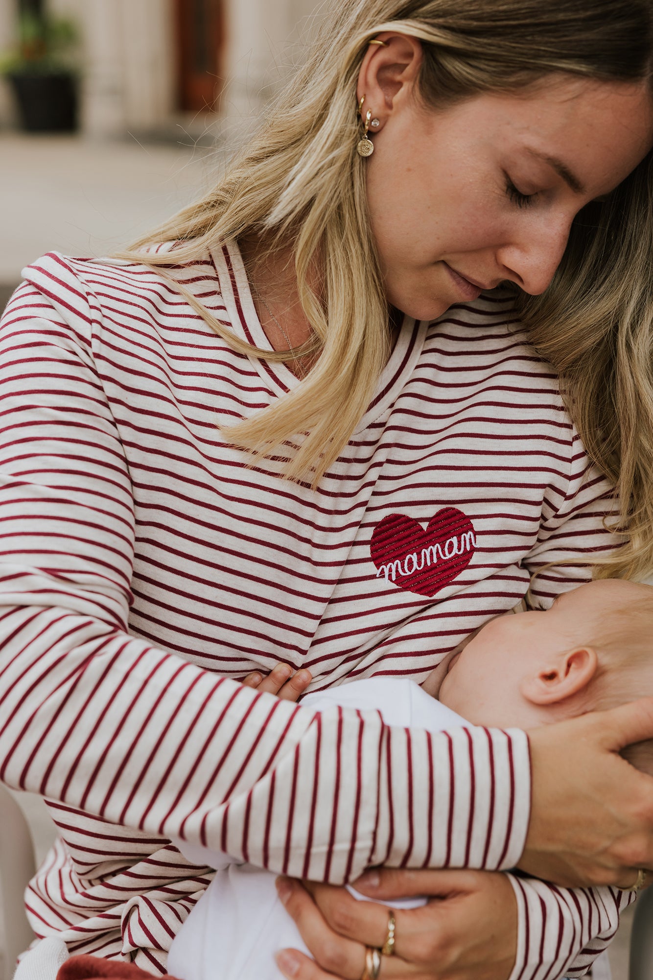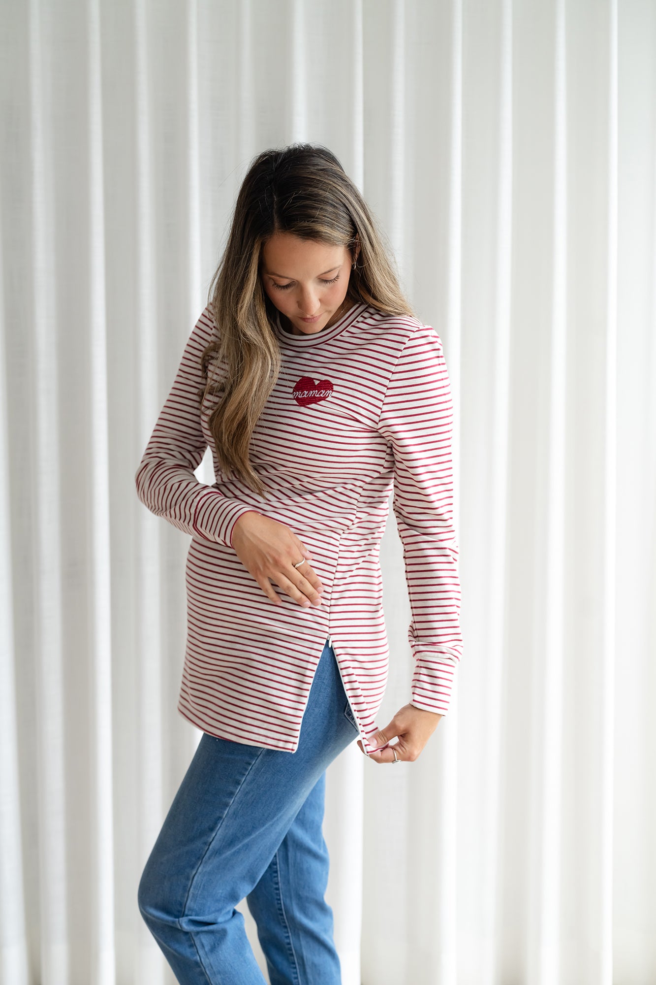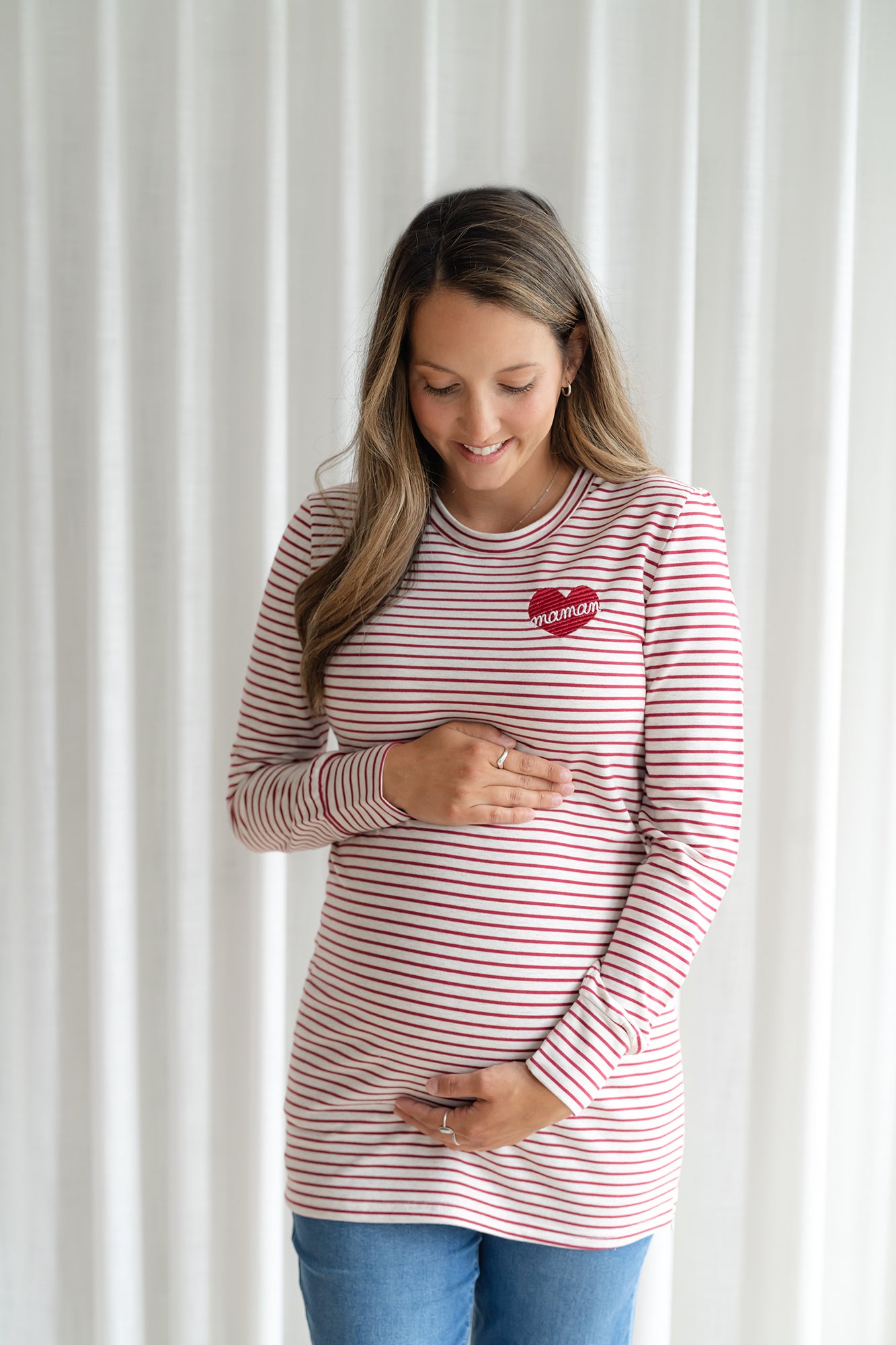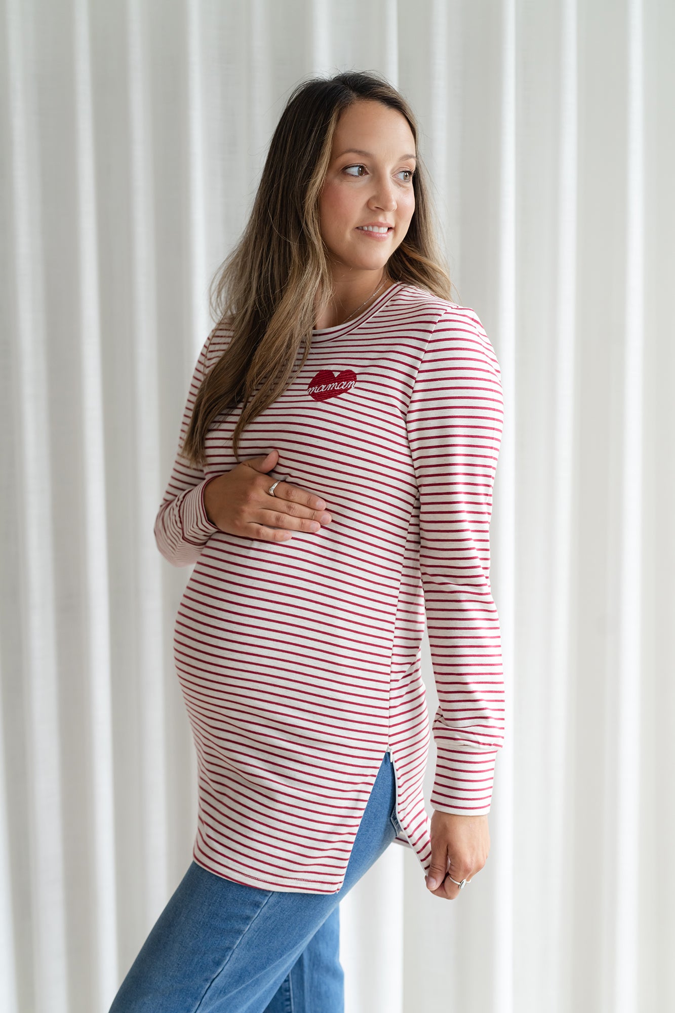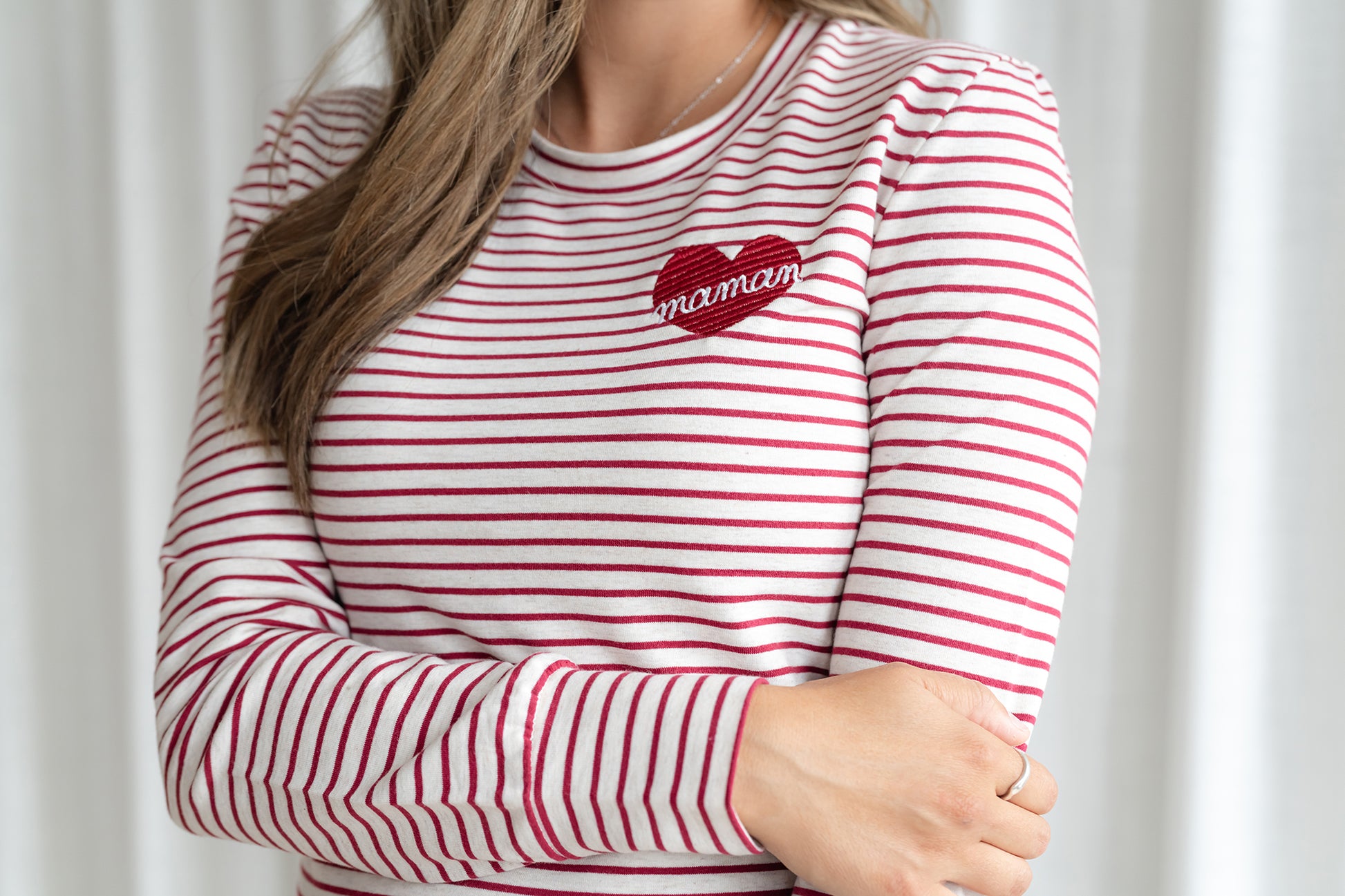 Nous collaborons avec l'entreprise Rose Maternité pour vous offrir notre design-Cœur "maman" (non-personnalisable) brodé sur leur chandail manches longues BÉATRICE adapté à l'allaitement. (cliquez ici pour le modèle personnalisable)