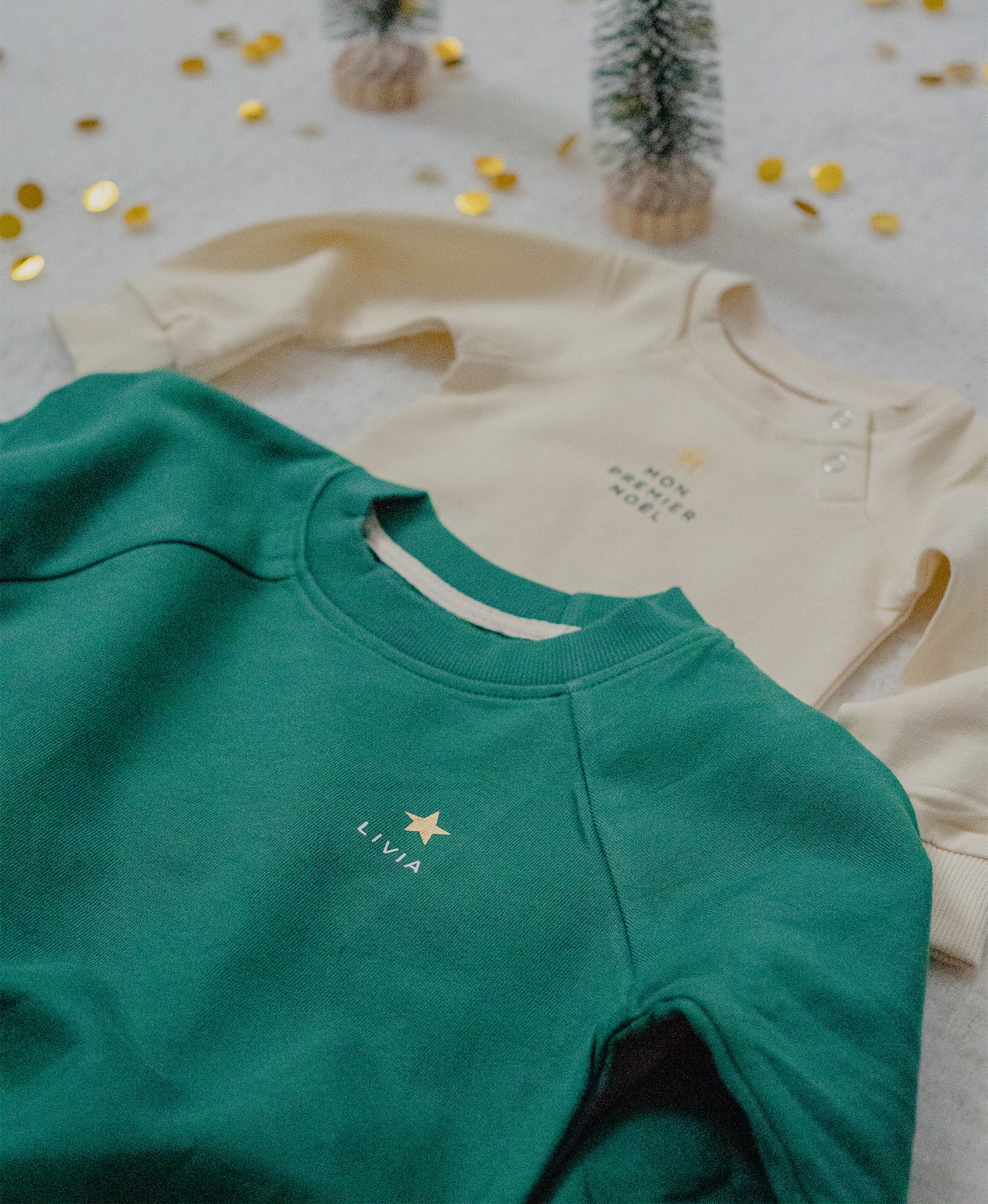 Dans la case de la ligne personnalisée, veuillez écrire toute la ligne qui se trouve en-dessous de la petite étoile dorée (ex: ''mon premier Noel'' ou ''bébé 2025'' ou ''bébé Demers'').