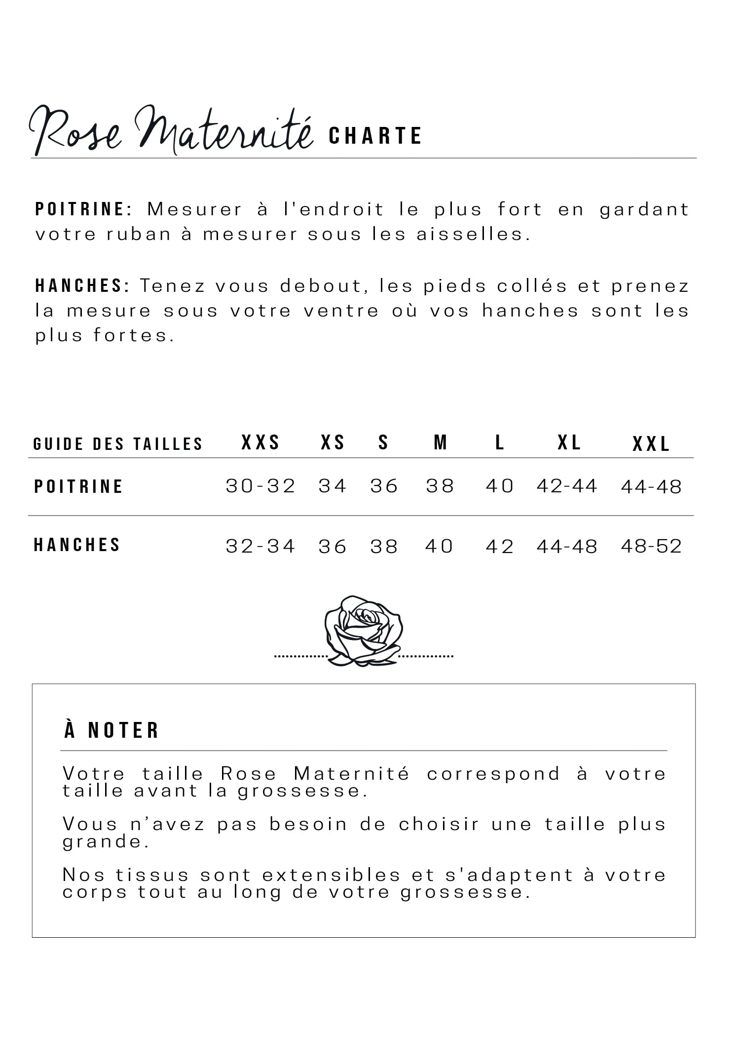 Merci de bien vous référer au guide de tailles de Rose maternité afin de choisir au mieux votre vêtement. Nous acceptons les retours pour ce produit non-personnalisé, cependant il est possible que nous n'ayons plus votre grandeur en stock au moment de l'échange. Notez également que la totalité des frais d'envoi pour les échanges sont à la charge du client.